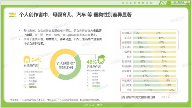 从个人创作者分布情况来看,女性创作者数量占比为54%,在财经、教育、情感等垂类下男女创作者内容偏好趋同,在母婴育儿、游戏动漫、汽车、生活等个别垂类中男女差异较为显著。