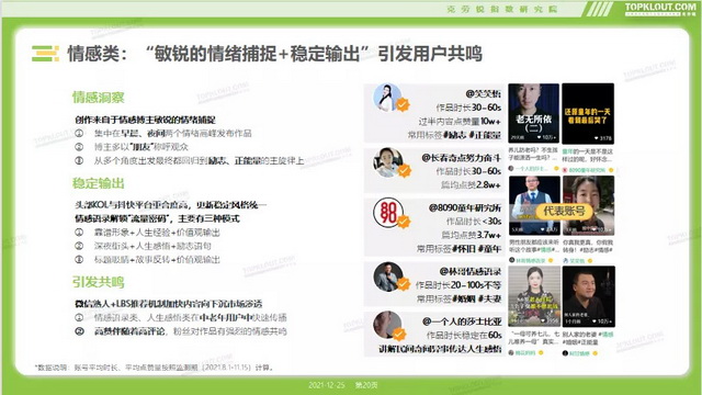 情感类内容特性相对突出,创作上敏锐捕捉用户情绪,以励志、正能量为主要方向;内容输出上相对统一,以情感语录解锁流量密码;最终目的都是引发共鸣,尤其情感语录类、人生感悟类在中老年用户中传播最为迅速。