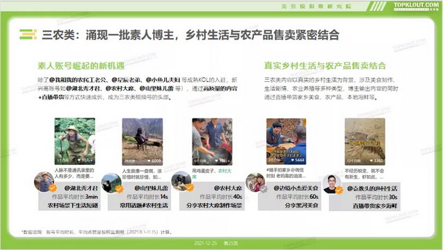 三农类内容作为最近比较火的领域,以真实朴素的乡村生活味背景带来另类的生活体验,由此涌现出一批素人博主,他们在输出内容的同时通过直播带货家乡美食、农产品等得以快速成长。