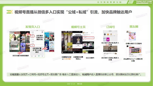 2021年以来,视频号直播战略地位不断升级,从发现页入口、视频号主页、订阅号消息、朋友圈分享等多个入口实现“公域+私域”引流,加快品牌触达用户。
