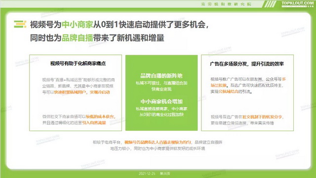 经过多次更新迭代的视频号已经和微信生态中的多个场景入口充分对接和融合,提升了引流效率,为中小商家的快速启动提供了新的机会。社交关系下的信任链接和私域积累,也为品牌自播带来了新机遇和增量。