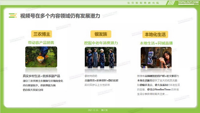 目前视频号内容生态还处在相对初步阶段,丰富程度有待提高。在用户对真实内容和烟火气内容需求下,三农类、银发族生活、本地化生活等多种内容仍有发展潜力。