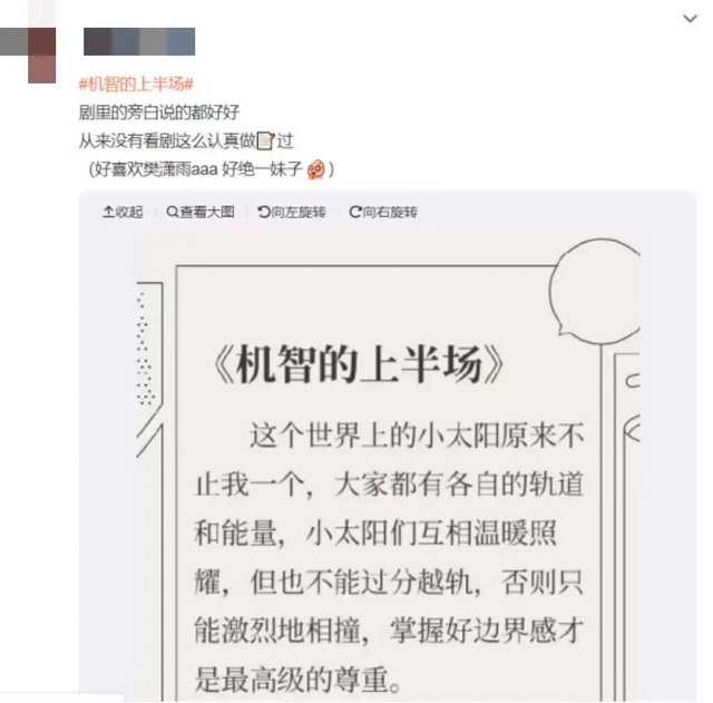 女性也终于可以夺回了自己的“解释权”。在优酷另一部现实题材剧集《机智的上半场》中,每一集都会有剧中角色樊潇雨的旁白,为剧情做出注释,也给了每个角色更丰富的解读。微博上有不少网友将这些旁白记录下来,并表示“从来没有看剧这么认真的记笔记”。