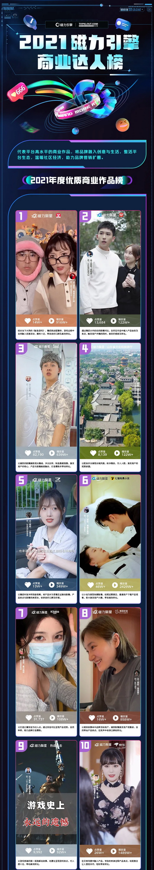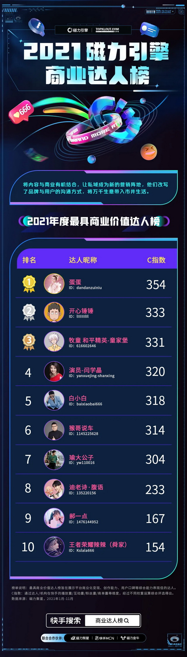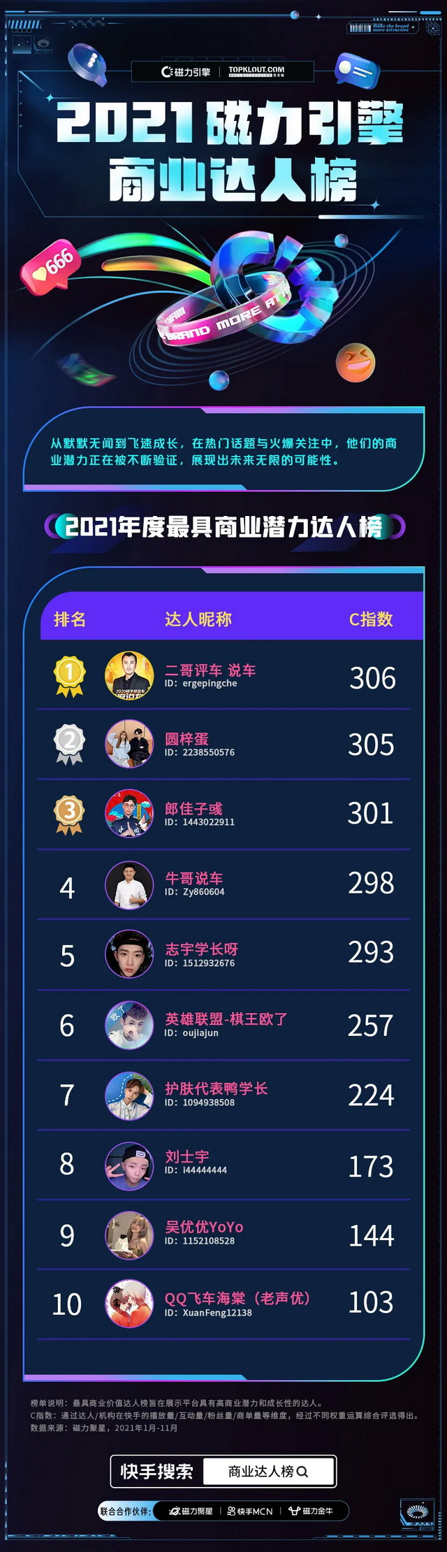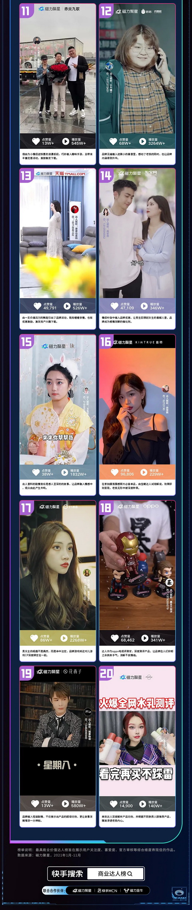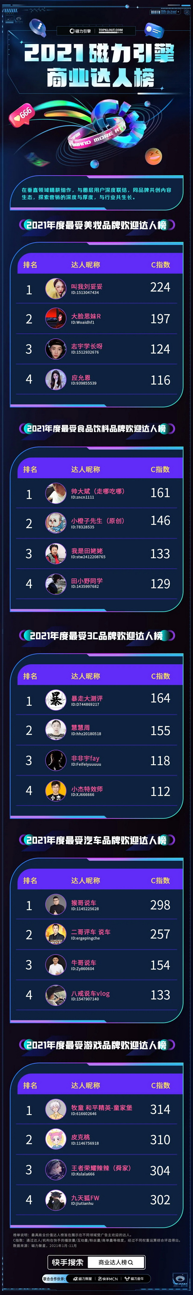 《2021磁力引擎商业达人榜》中,达人榜和机构榜通过达人/机构在快手的播放量/互动量/粉丝量/商单量等维度,经过不同权重运算综合评选得出;商业作品榜通过商业作品在快手发布后吸引新用户关注量/互动量/官方审核等级等多维度,经过不同权重运算综合评选得出。