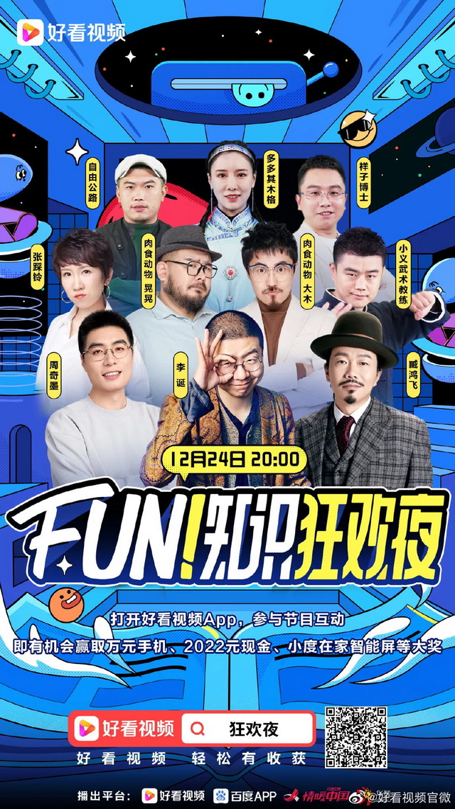百度旗下的短视频平台好看视频,今年的跨年节目略有不同。他们联合了江西卫视,在平安夜举办了一场名为《FUN!知识狂欢夜》的脱口秀。发起人李诞,登台的周奇墨、肉食动物等脱口秀演员,还有4位好看视频的内容创作者,祥子博士、自由公路、小义武术教练和多多其木格。