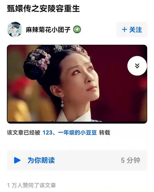 《甄嬛传》中的嫔妃安陵容出身卑微,一路小心翼翼,最后被皇后作为打击甄嬛的棋子而死去。知乎有不少同情和喜爱这个角色的答主,在一系列问题如“发现自己是安陵容,怎样才能避免悲惨结局”下方,大开脑洞,给安陵容出了许多主意。
