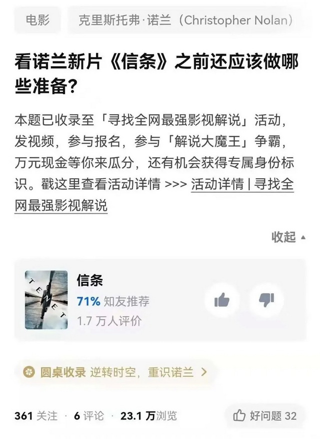 去年《信条》上映之前,知乎上就出现了“看《信条》之前需要准备什么”的问题,就读文学硕士的知友深入探讨了片名的含义,提前在别处看过电影的知友则给抛出了几个片中的物理学知识,也有答主表示:不需要任何准备,去看就好!