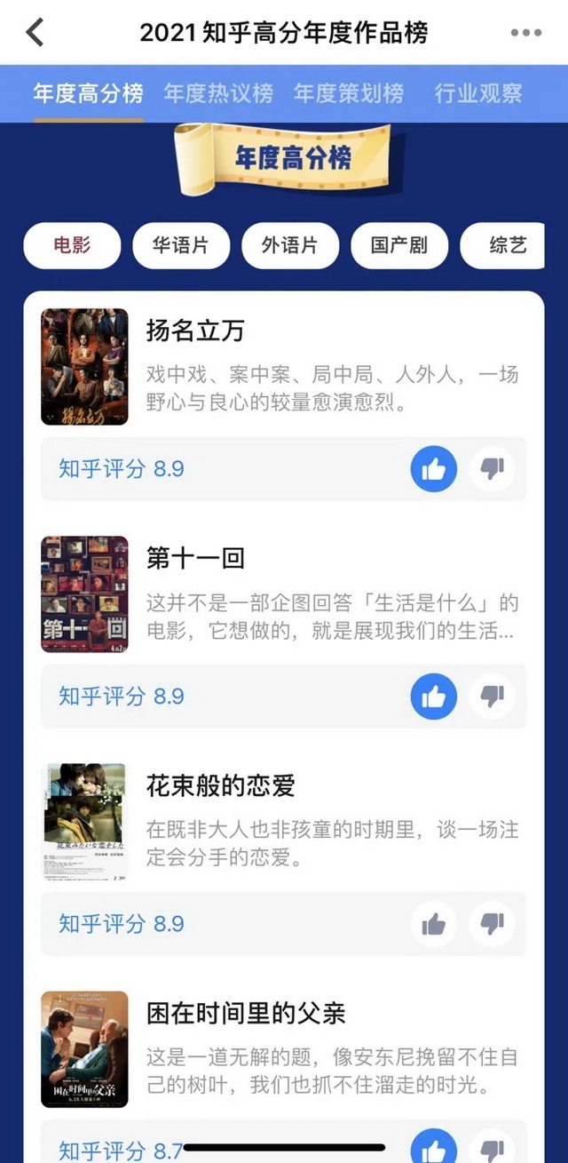 打分机制完善后,每年年末的榜单也成为一个固定项目。2019年,知乎基于用户评分行为及超过75万条评价数,发布了“年度小蓝星推荐”榜单,其中就有影视作品榜单;2020年则增设了综艺榜单。