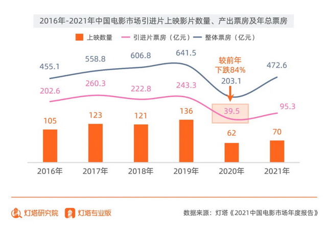 但一方面在疫情的持续影响之下,引进片数量锐减,另一方面受困于众多IP系列续作乏力、流媒体平台同步发行等因素的影响。近年来引进片在内地的票房表现愈发疲软,在2021年全年票房中引进片的占比已下滑至20%。