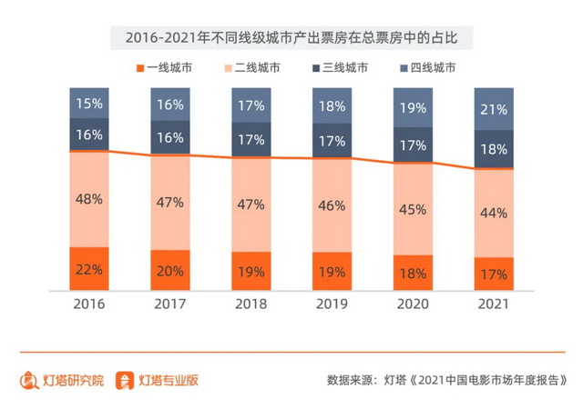 从不同的地区来看,2021年下沉市场在持续发力,其中四线城市所占票房份额达到了全国市场的21%,已经连续两年超越一线城市,正逼近二线城市的一半水平。中国电影的银幕增长正在放缓,未来的增长驱动力,将更多来自于下沉市场。