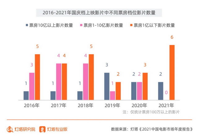 但这样看似有迹可循的定档思路,真的能为这些中腰部影片搏得一线生机吗?热门档期的马太效应仍在加剧,中腰部影片所处的第二梯队票房空间在被持续挤压。以国庆档为例,2021年国庆档诞生了两部10亿+的超体量影片,但同期定档的影片却再无亿元以上的票房表现。