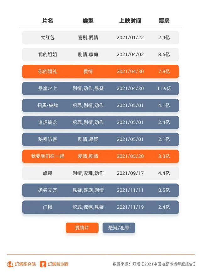 灯塔《报告》显示,在2021年选择冷门档期上映的影片票房超过两亿元的影片累计12部,其中爱情与悬疑/犯罪类型影片占据9席。这些强类型的影片在相对冷门的档期里,一方面避免了与超体量影片肉搏厮杀,另一方面,其突出的类型元素得以在社交平台上制造更为长线的影片营销战场。