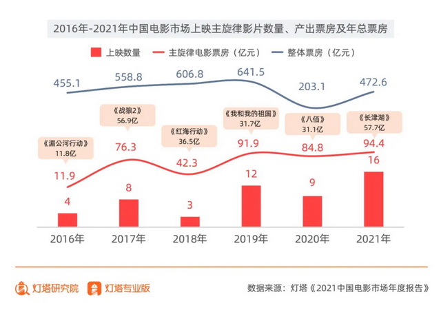 根据灯塔《报告》,2021年,共上映16部主旋律题材向影片,累计票房达到94.4亿,占据全年票房收入20%,已经连续两年在票房占比上超过引进片,更加重要的是主旋律电影在过去的几年时间里,从内容表达到制作体量,已经实现了一场全面进阶。