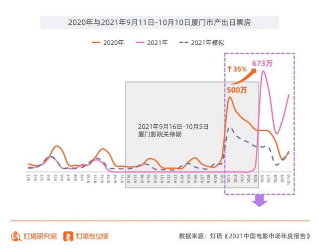 灯塔《报告》以厦门市为例,展示了这一现象。在九月中下旬,厦门由于疫情原因全市影院多次关闭,10月6日才重新开张。当地观众在解封当天贡献了673万的票房,这一数字甚至超过了去年国庆假期首日的票房表现,而这样激烈的观影热潮,持续了近半个月。