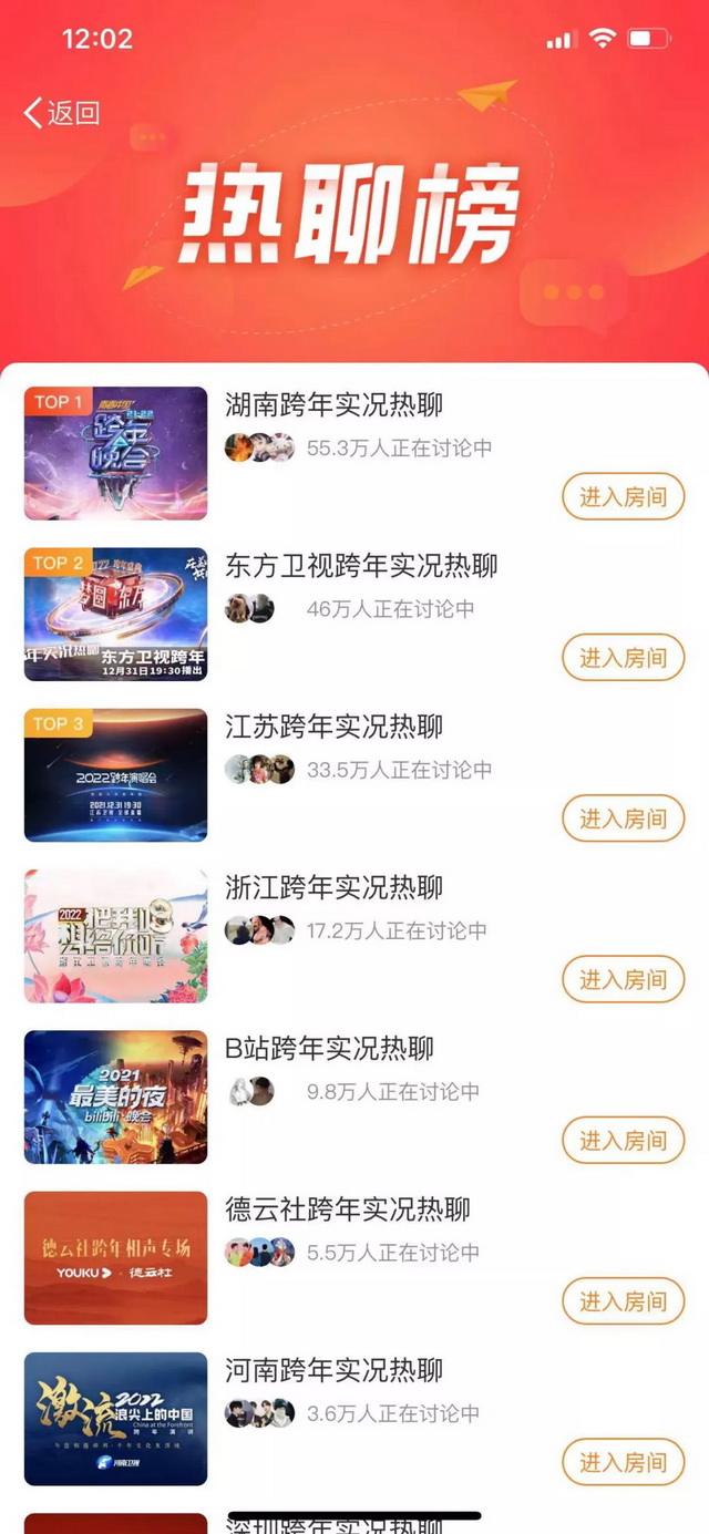 基于微博本身的社交媒体属性,在跨年晚会播出过程中,微博针对不同晚会开设了“聊天室”,进一步满足了观众互动的需求。0时差的实况热聊功能将相同爱好的网友汇聚到同一个房间,并提供嘉宾“空降翻牌”等活动,实时在线人数峰值达到191万,实况讨论超过1500万条。