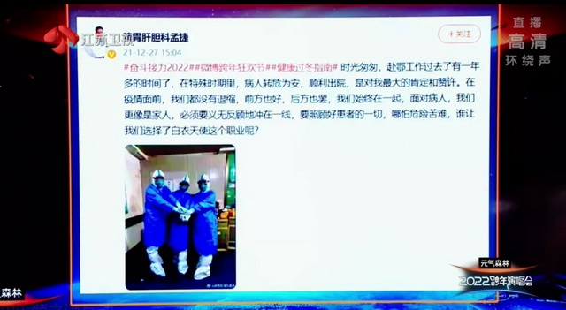 跨年晚会的四个小时只是微博跨年缩影。2021刚刚结束,就有不少网友分享自己与好友的跨年故事。#2022年第一条微博#的词条下,有超过1000万条内容,他们在这里回顾2021年的点点滴滴,也写下新一年的愿望。在发博日期从2021跳到2022年的瞬间,仿佛完成了一场发生在赛博空间的、郑重的交接仪式。