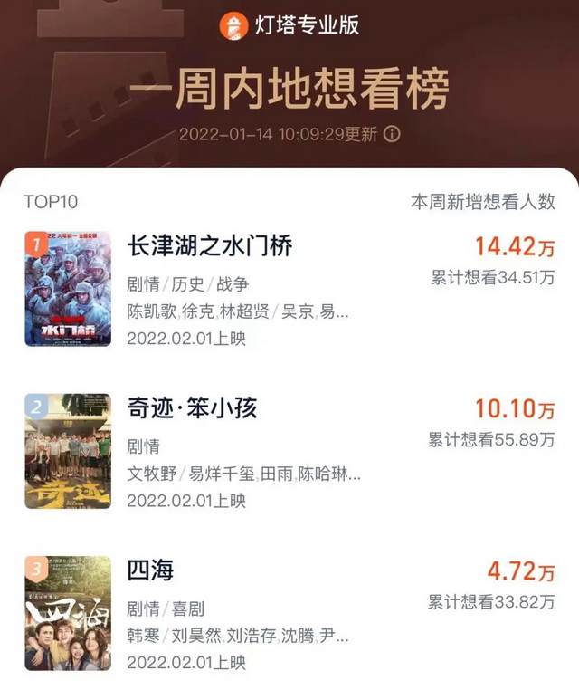 另外,目前《水门桥》的影片时长尚未可知,但如果仍然延续《长津湖》的近三小时时长,那么从排片角度,热度第一的它会占据掉更多的其他影片的排片时间。这会使得其至少在头几日积攒下来的票房优势更加明显,后续逆袭更加困难。