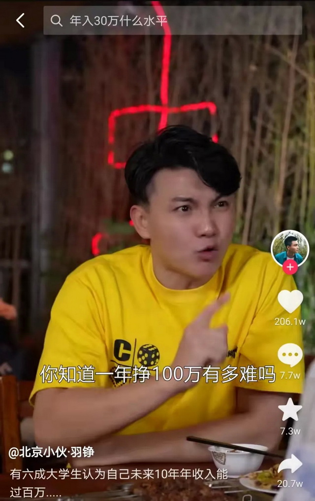 以上内容,都来自于@北京小伙·羽铮 ,一个靠“怼人”走红的短视频博主。这条视频在抖音点赞已经超过206w,评论量也有7.7w,可见他的内容观点还是获得了观众的一致认可。