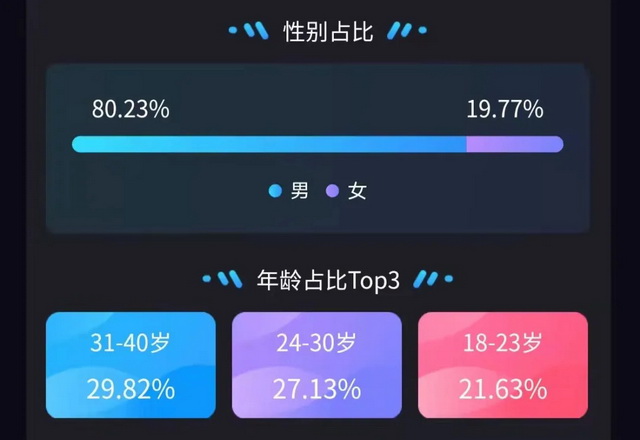 克劳锐指数小程序显示,羽铮男性粉丝占比高达80.23%,且大多集中在31-40岁,粉丝画像和带货商品的高度匹配,无疑能够提升销售转化。