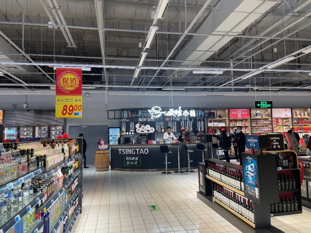 酒吧设置在酒水区最里面,有调酒师现场调酒,氛围感驱使下更容易让人产生买酒的欲望。