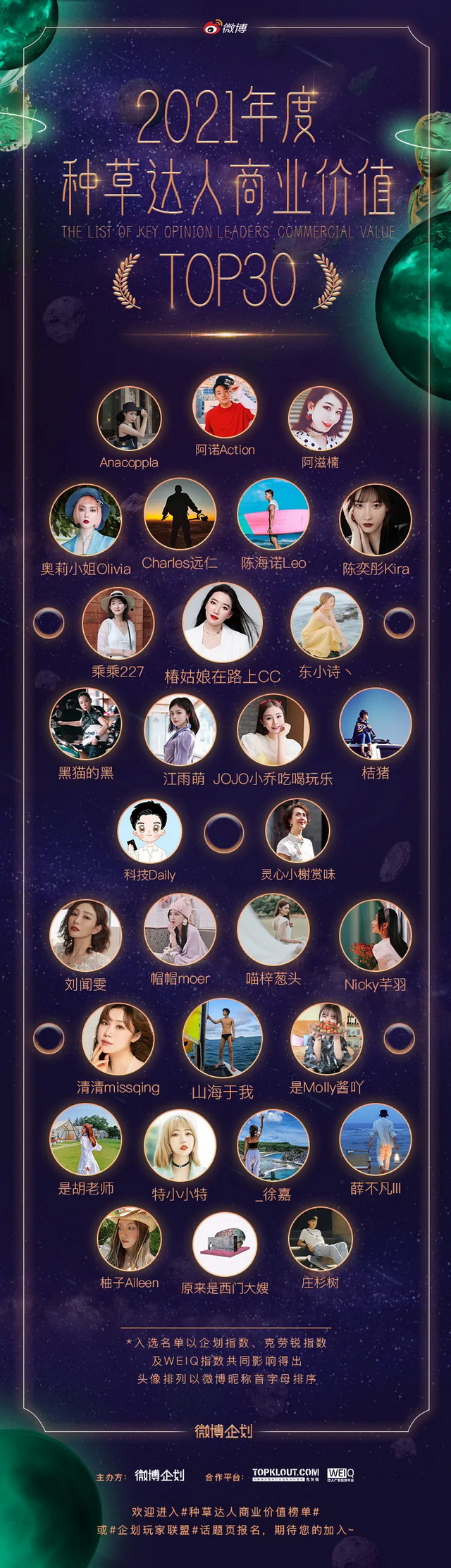 值得注意的是,本次“2021年度种草达人商业价值TOP30”是基于微博企划指数、克劳锐指数、WEIQ指数三方综合数据得出,从不同维度对微博种草达人的种草力、商业力、影响力进行了科学真实的度量和评估,每个榜单都更可靠、可信。