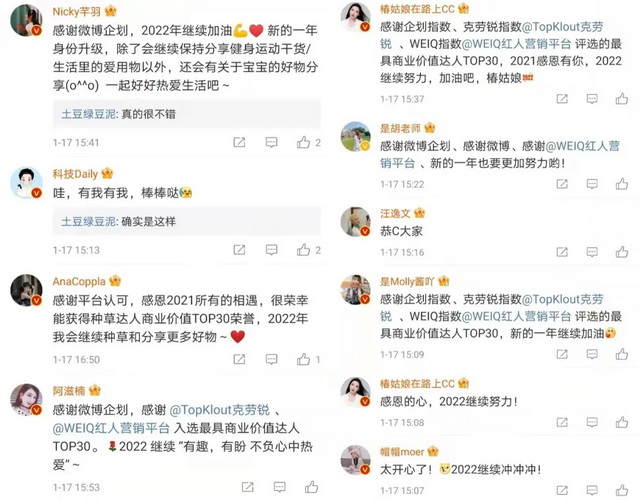 “2021年度种草达人商业价值TOP30”的发布,将有潜力、有价值的种草达人充分挖掘,为品牌精准内容营销提供有效参考。上榜达人也纷纷在评论区表示“2022年继续分享和种草好物”,为网友带来更多有价值内容。