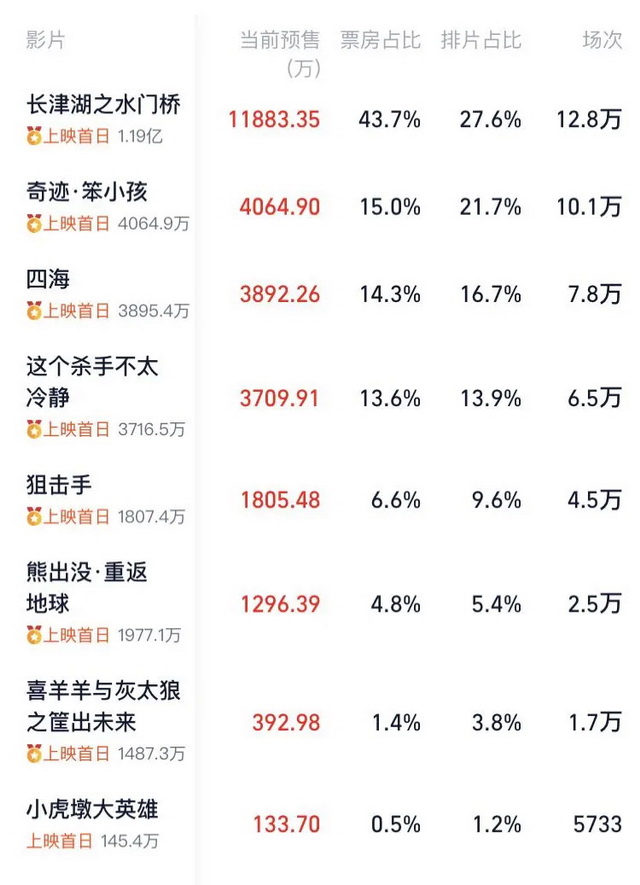 预售不仅能看出观众的购票意愿,同时也能一窥影院的首日排片状况。预售的排片和票房,可以大致展示春节档影片整体的梯队格局。