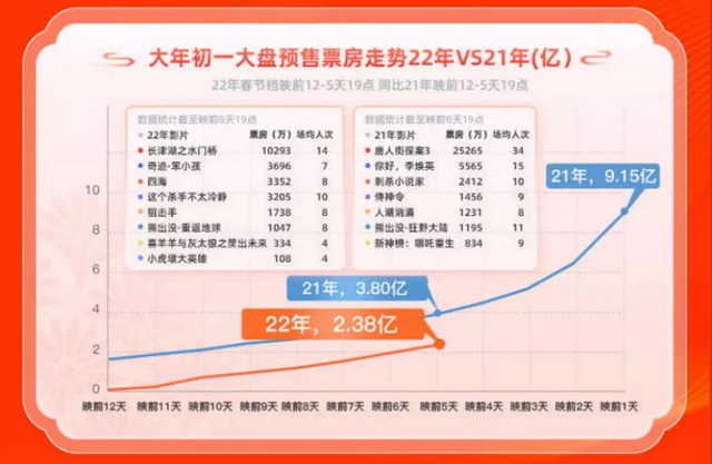与去年同期的成绩相比,这一预售状况算不上好。根据灯塔专业版数据显示,按映前天数同期对比,2022年春节档单日预售均较去年有所下降,去年的大热影片场均人次也相对更高。以1月27日映前5天的数据为例,今年预售总票房为2.38亿,而去年同期为3.8亿。