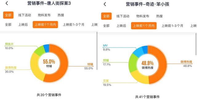 根据灯塔专业版数据显示,对比去年同期的大热影片,在影片上映前一个月内,除线下活动外《唐人街探案3》共20个营销事件(包括MV或主题曲、预告片、海报、特辑、热搜等等)、《你好!李焕英》共12个,而到了今年,《水门桥》共21个、《四海》共31个、《奇迹·笨小孩》更是高达40个。片方的宣传投入可见一斑。