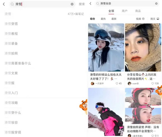 尤其是滑雪穿搭类内容,从平价款、时尚款滑雪服到颜色搭配、明星同款应有尽有,即使不会滑也能成为最亮的崽。除此之外,“冰雪妆”也显示着小红书的种草基因。@粒粒辰o 的“冰雪奇缘”、@毛晓彤 的跨年晚会冰雪妆、@布兰妮老田田 的欧阳娜娜冰雪公主仿妆……都收到了大量的点赞。