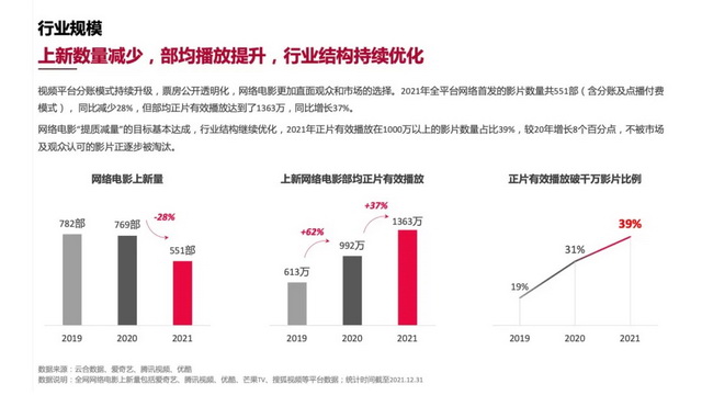 据《2021中国网络电影行业年度报告》显示,2021年网络电影上新量为551部,相较于前一年同比下降了28%。但上新网络电影部均正片有效播放却达到了1363万,相较于前一年同比增长了37%,正片有效播放破千万影片的比例也从前一年的31%提升至39%。