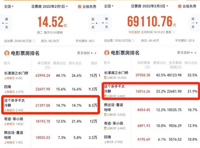但逆袭的故事还是发生了,大年初二《杀手》的排片占比已上升至了三个百分点,2.14亿的单日票房较上映首日还有小幅提升。截至目前,《杀手》累计票房已突破6亿,已经与排名三四位的《四海》《奇迹》拉开近三亿的差距,看似要稳坐今年春节档的票房亚军之座了。