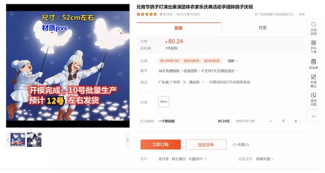 也正因此,鸽子灯的发货时间大多滞后,甚至不同层级渠道也显示出不同的速度。「电商在线」搜集发现,1688上的生产工厂大多12号可以发一批货,赶在元宵节之前可以拿到现货。但向下传递到C端渠道,很多都注明要在2月底发货,最晚的甚至推迟到了3月初。