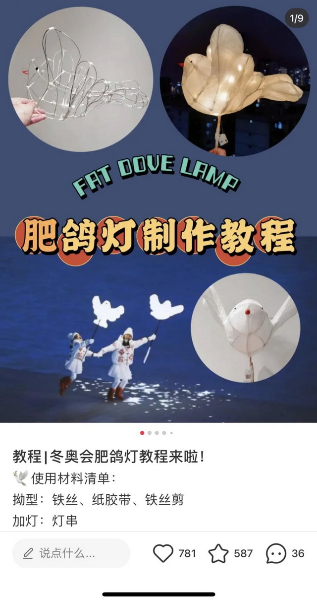 社交平台上更是有一批人“自力更生”,小红书上关于冬奥鸽子灯教程已有600多篇,网友的目标是“元宵拥有一只可爱的鸽子灯”。