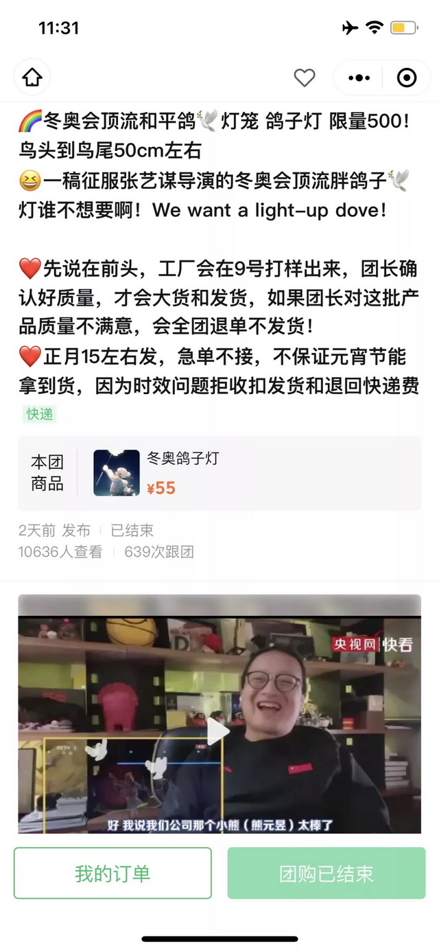 2月5日,即冬奥会开幕式结束的第二天,网上就已经挂出了冬奥会同款鸽子灯购买链接,但仅为预售。「电商在线」发现,近几天销售同款鸽子灯的店铺变得更多,渠道也更多元,除了电商平台之外,小红书、微博、微信拼团等渠道也纷纷加入。