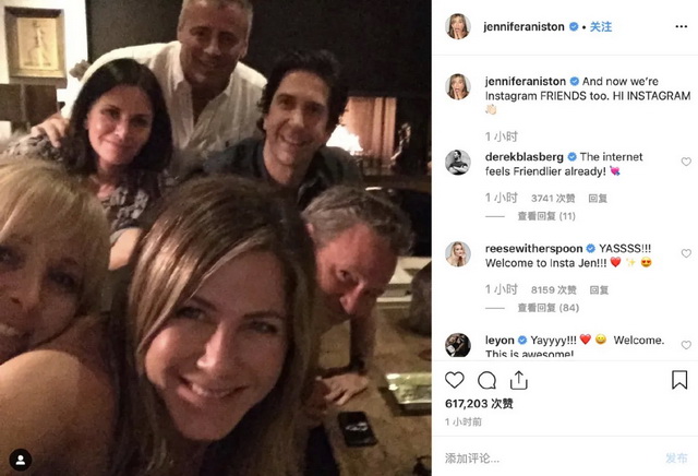 即使用当下的流量标准来衡量,他们的人气也并不输阵。2019年,Rachel的扮演者安妮斯顿注册了Instagram账号,发布了六位主演的合照,一度导致平台服务器瘫痪。而她也是当时Instagram史上涨粉速度最快的明星。