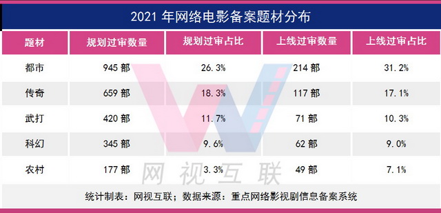 除数量持续领跑的“都市”题材外,传奇题材规划过审659部,武打题材规划过审420部,科幻345部,农村177部,占比也相对稳定,是网络电影市场备案最热门的五大题材。