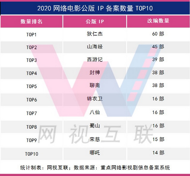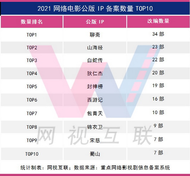 网视互联统计出了2021年备案最多的10大公版IP,其中“聊斋”相关题材高达34部,仅“画皮”就有6部,成为公版IP改编的大热门。
