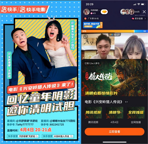 创新性的营销策略和更趋生动的互动方式,也已经成为了快手营销过程中的常态。以王晶导演新片《倚天屠龙记》为例,该片以PVOD模式上线,与快手合作,利用快手高粘性的直播生态,联动头部电商主播周周(快手号:zhouzhen)与主演林峯(快手ID:2711720314)直播秒杀点播票券,开启了全网首次单片付费影片直播预售的先河。