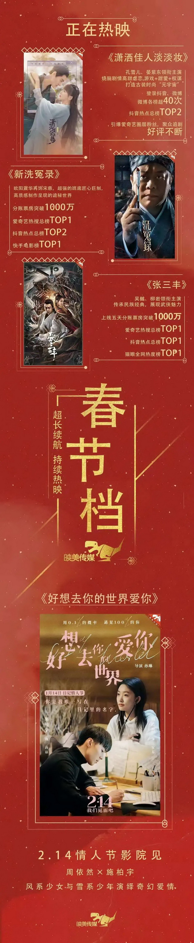 值得一提的是,除了定档情人节的《好想去你的世界爱你》之外,2022开年不到一个月,映美传媒已经有三部作品上映,分别是1月6日在爱奇艺上线的网络电影《新洗冤录》,1月14日在爱奇艺独播的网剧《潇洒佳人淡淡妆》和1月22日爱奇艺独播的网络电影《张三丰》。截至1月30日,《新洗冤录》票房分账已经达1070万,《张三丰》上映八天,票房更是高达1330万。《潇洒佳人淡淡妆》上线后相关话题登上抖音、微博等榜单超50次,同样表现不俗。