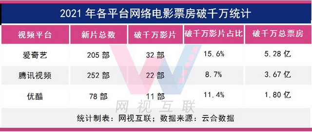 其中,爱奇艺单平台破千万影片高达32部,破千万影片数量占比15.6%,破千万影片累计分账票房5.28亿;腾讯视频单平台破千万影片22部,破千万影片数量占比8.7%,破千万影片累计分账票房3.67亿;优酷单平台破千万影片11部,破千万影片占比11.4%,破千万影片累计分账票房1.80亿。