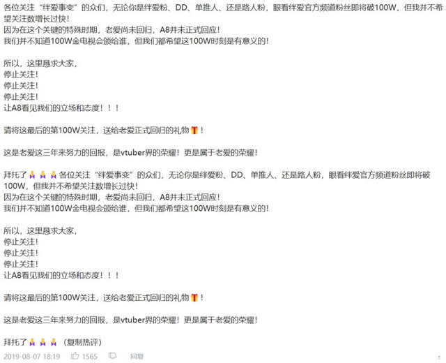 “绝对不会妥协,被其他人占用的绊爱于我而言没有任何意义,要让Activ8看到我们的意见和态度!”粉丝们在B站、YouTube等平台发起了“取消关注”的抗议活动。在中国和日本的漫展上,绊爱的展区前所未有地冷清,周边销量也产生了下滑。甚至有偏激的粉丝向Activ8的社长大阪武史发出了杀人威胁。