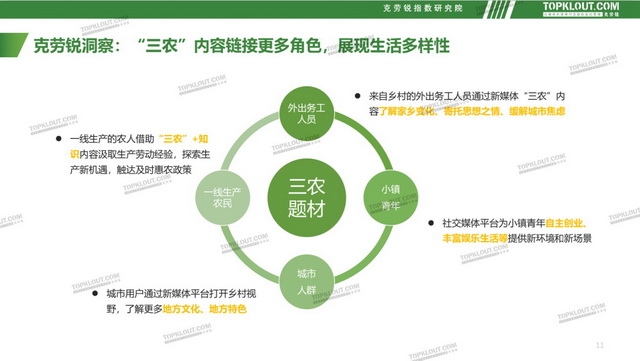 内容行业走向新的变化,其最大的价值成为:让好内容“流”向最需要的地方。正如克劳锐在《社交媒体“三农”内容发展趋势洞察》报告中所说,让人感受到“三农”——这个内容时代“新农具”的强大势头,在乡村振兴的大背景下,“到农村去,助推乡村振兴”的“乡村风”逐步在自媒体内容创作者中掀起新一轮的流量风口。