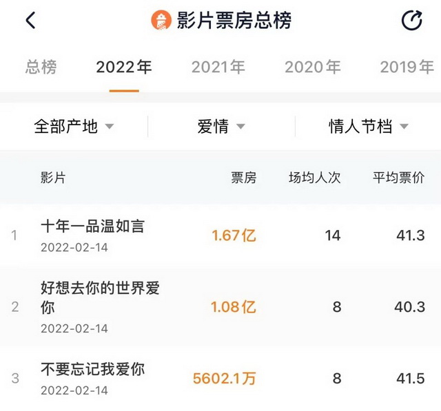 这一点,在票房上有最直观的呈现:今年情人节档期的《十年一品温如言》在上映第二天单日票房就滑至一千多万,另外两部新片票房还不过千万,相比情人节当天是断崖式的下坠。
