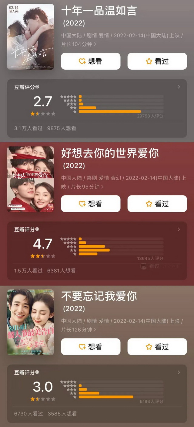 以情人节上映的《十年一品温如言》《好想去你的世界爱你》《不要忘记我爱你》为例,虽然豆瓣平均评分不到3.5,观众口碑也全面溃败,但依然借由档期优势总体收割近三亿票房。
