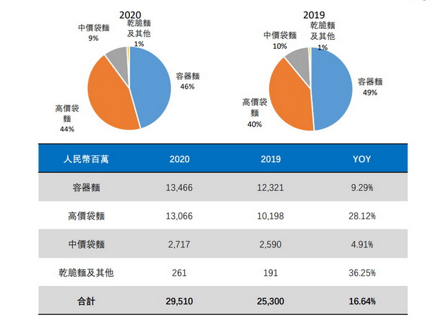 康师傅2020年财报数据显示,高价袋面的销售额已占据产品销售额的44%。因为产品升级和生产优化的因素,方便面毛利率也同比上涨到了29.30%——高价面和高端面成为了核心产品。