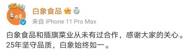 315土坑酸菜曝光后,“白象食品和插旗菜业从未有过合作。”掷地有声的一句否认,让白象再次登上热搜。