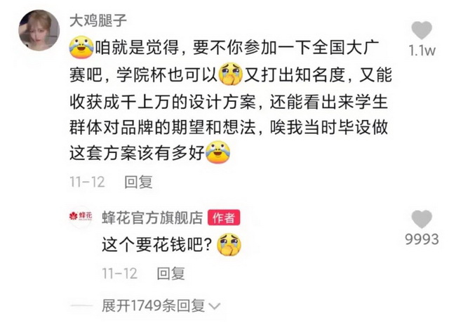 网友建议蜂花赞助参加全国大学生广告艺术大赛,蜂花回复到:这个要花钱吧!还有网友评论蜂花好用是好用,就是包装有种廉价感,蜂花再次回复:其实我们本来就很廉价。为了自证没有倒闭,蜂花小编“自黑式”澄清,称公司没有广告部门,从来不打广告所以渐渐被遗忘了,连主播也都是车间和研发室来的……
