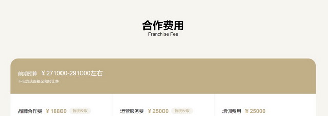 官网显示,除去店面租金和转让费,加盟费用在27~29万元之间,其中18800元的三年品牌合作费和25000元的运营服务费可以在开店13个月时缴足,如果在12个月内闭店,就免除这部分费用。