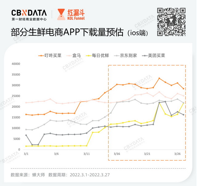 “这几天我手机里多了一堆生鲜APP,每个平台抢菜时间不一样,需要轮流蹲守”,小区正在封锁期的小兰告诉CBNData。她的情况也是大多数隔离民众的现状。据蝉大师显示,以ios端为例,3月中旬以来,生鲜电商APP的下载量迎来了新的高峰。